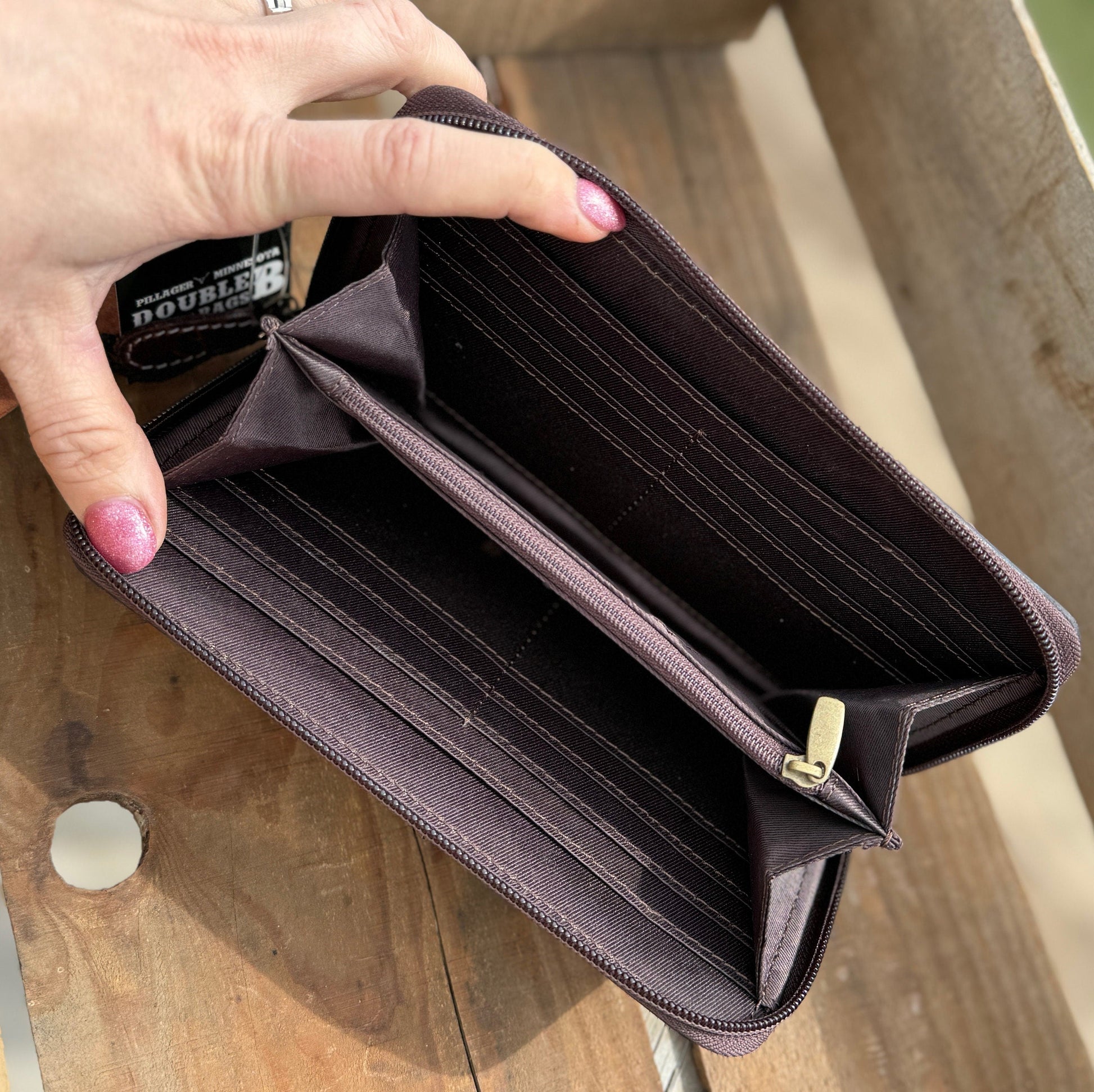 Features: Genuine Leather, Tooled details, Zipper closure, 4 card slots, Cash Slots, and one inner zipper pocket.