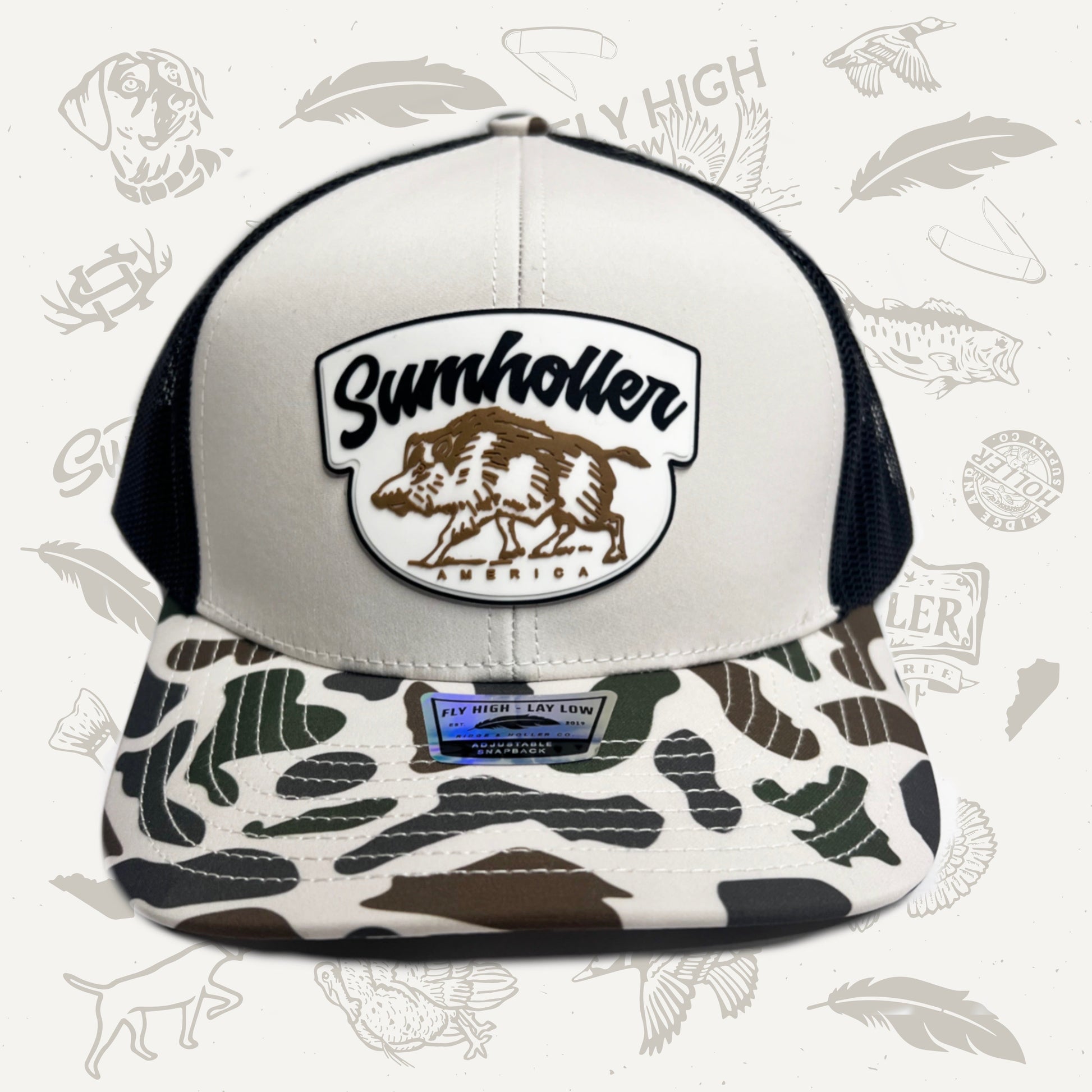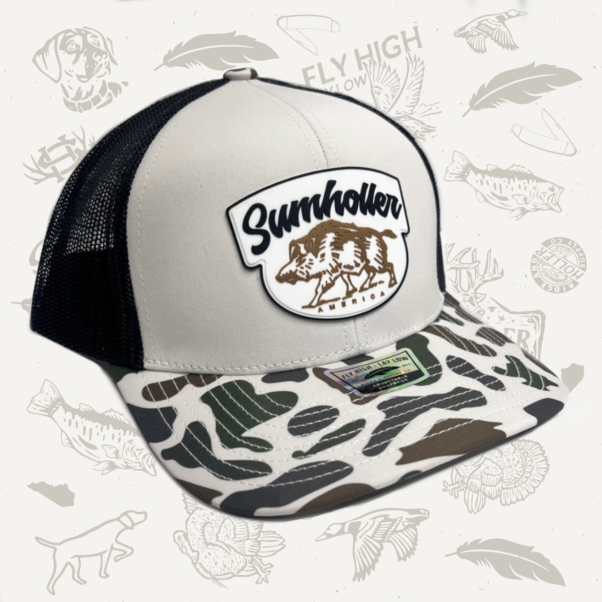 Introducing the Wild Boar hat, the newest addition to the Sumholler family. This boar-adorned mid rise hat in white/dark graphite with camo bill is a must-have for any outdoor enthusiast with a love for hunting! Perfect for reeling in compliments and showing off your unique style. Grab yours now!