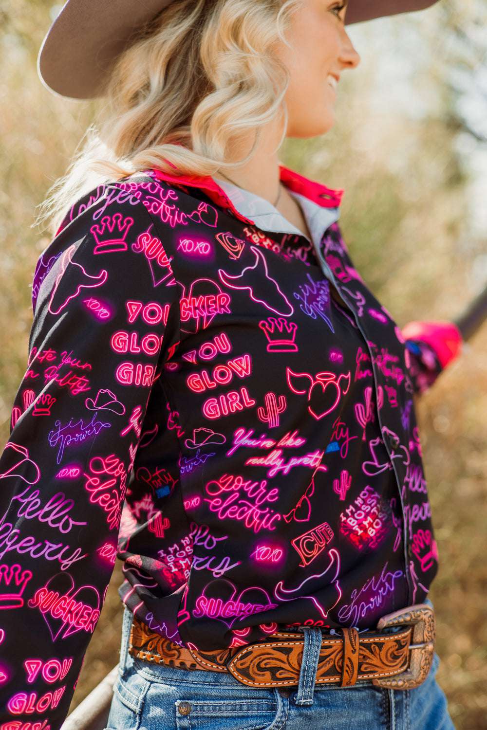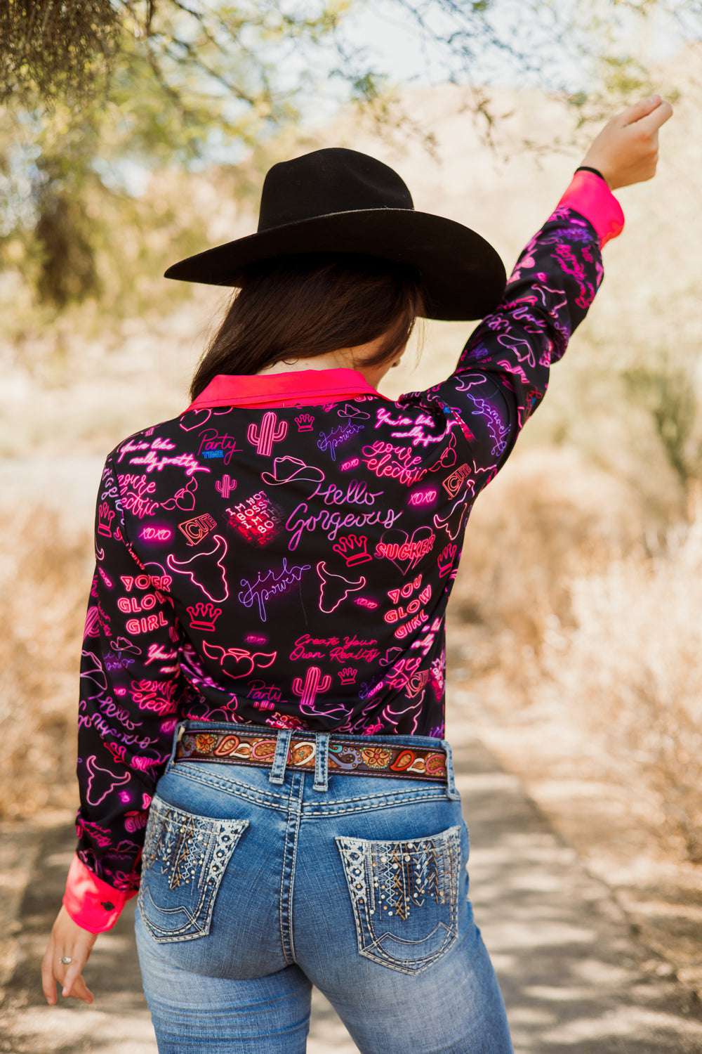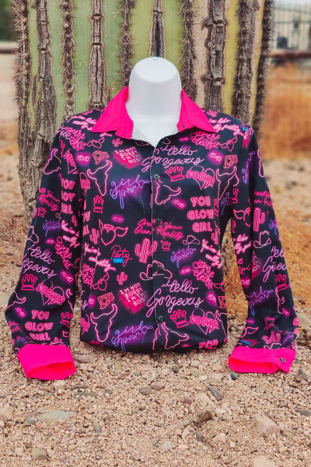 Radiate confidence in our You Go Girl Button Down. It's like a power surge for your wardrobe. From sassy boss proclamations to glow-up affirmations, this shirt's got sayings that'll make your inner diva two-step. With hot pink cuffs and collar adding an electrifying pop, this shirt isn't just clothing; it's a neon-lit declaration that you're here to wrangle life and look fabulous while doing it. So slap on this shirt and roll up to the pen like you're leading a parade, because life's a runway, and you're rocking it like a boss!